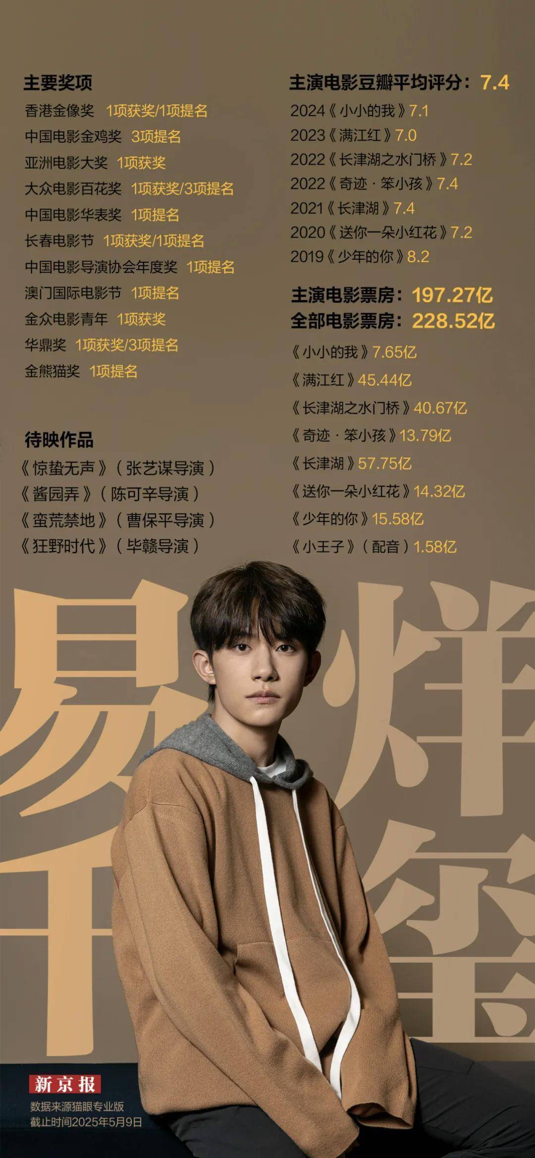 戒指2025年5月9日,易烊千玺主演电影总票房约197.27亿元,位列中国男演员真东说念主出/div>