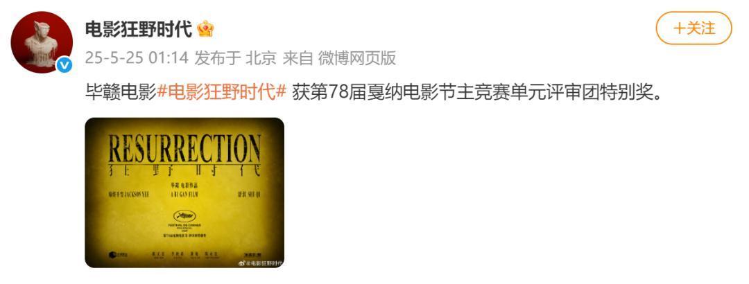 5月24日凌晨,电影《狂野时期》微博发布音讯,由毕赣导演,易烊千玺、舒淇领衔主演的《狂野时期》获本届戛纳电影节相等奖。