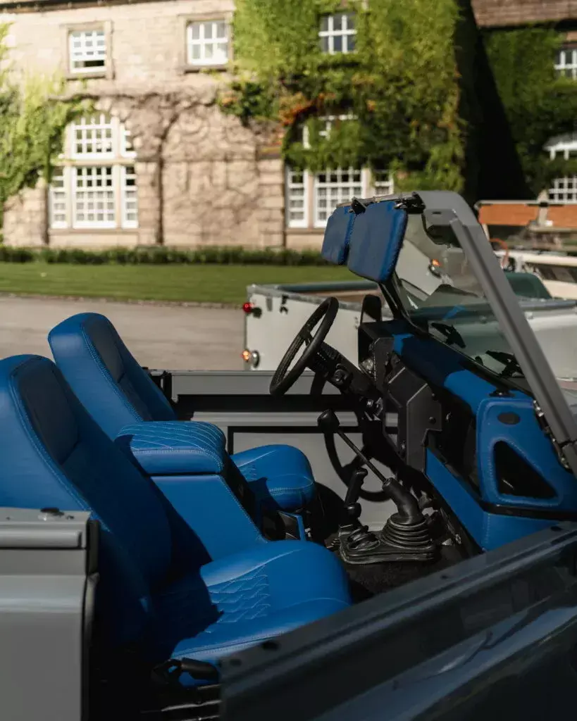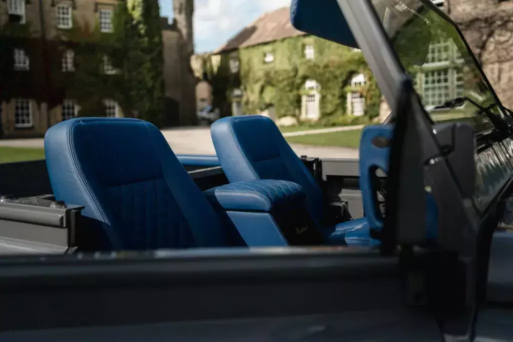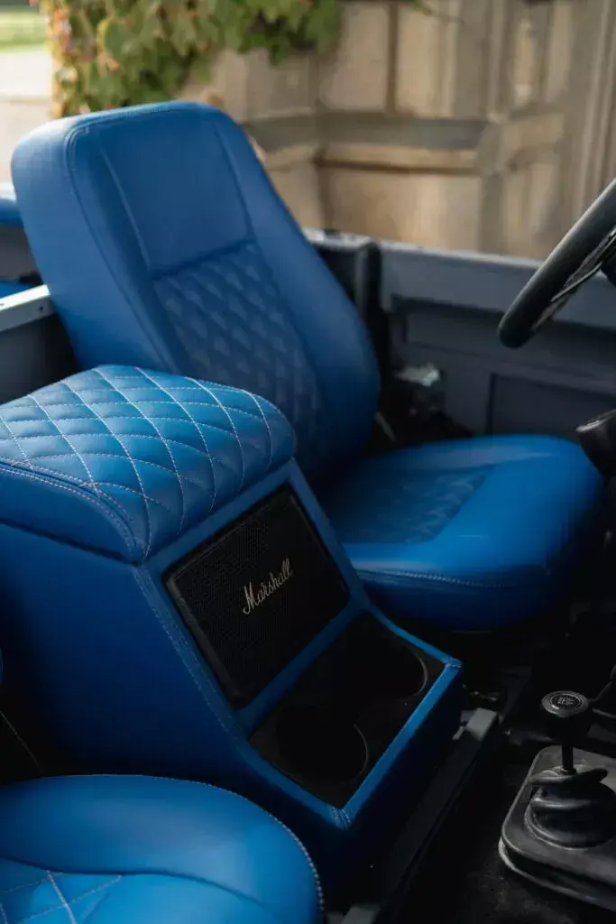 内饰秉承了Muirhead埃及蓝真皮进行重新包裹,包括中控台、座椅、扶手箱以及遮阳板,并加入了缝线工艺作隐敝。