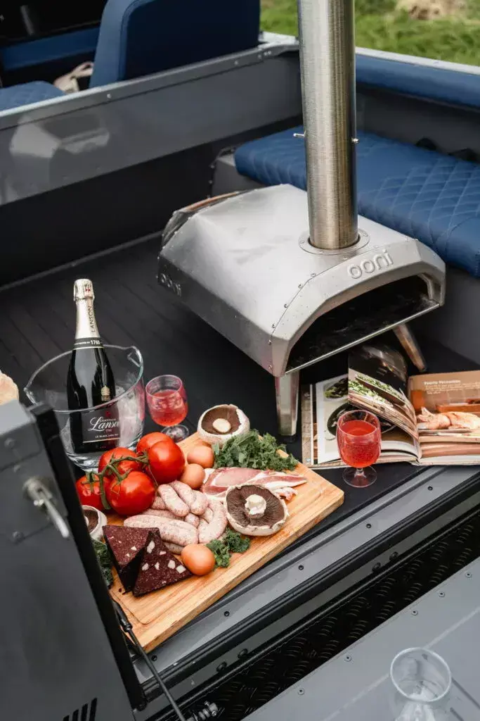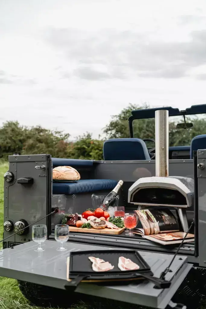 后座安排了一个Ooni的便携式户外披萨烤箱,只消开着这辆敞篷卫士90,就能随时享受阳光与野餐。