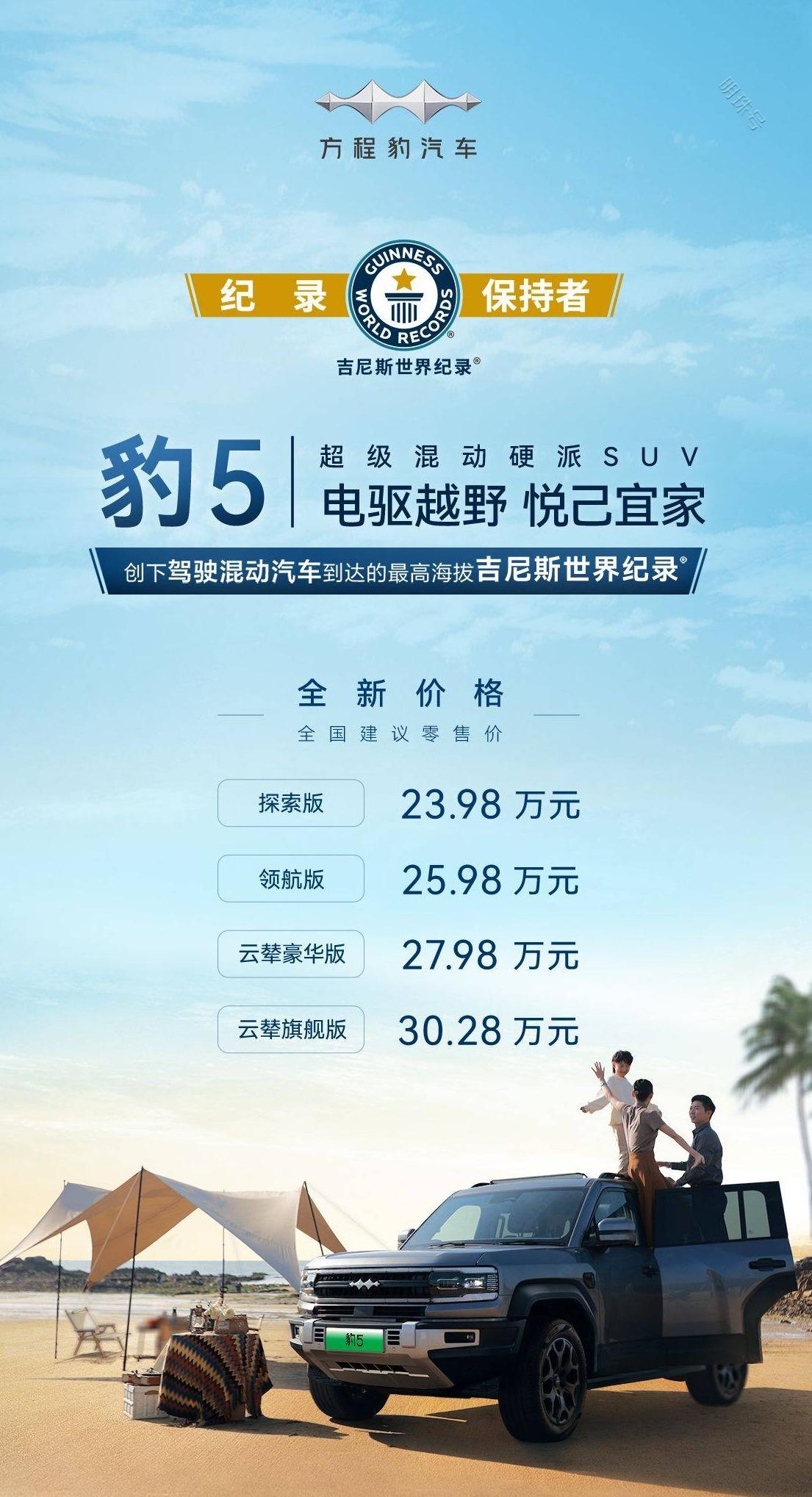 最近,比亚迪文牍方程豹开启焕新策略,产物线、渠谈及价钱带方面均将进行彭胀及拉宽,要杀青期间平权,让更多糜掷者大约以低资本的上风,享受到期间带来的越野和出行便利。用老匹夫的大口语来说等于:让糜掷者以更低的资本买到好车。就在7月29日,方程豹汽车官方文牍,豹5的零卖价下调,全新的价钱区间是23.98万元到30.28万元,以更飘荡力的价钱和性价比面向糜掷者。不错细目,新价钱会渗入到多个同类车型的价钱区间,变成贴脸开打的势头,更有意于硬派越野汽车粉丝享受到竞争带来的购买实惠。无人不晓,方程豹豹5所罗致的是DMO超等混动越野平台,1.5升涡轮增压发动机和双电机能源系统具备超500kW最大功率、760N·m最大扭矩,零百加快大约达到“4秒级”。这一平台期间架构让豹5领有了比好意思燃油5.0T的能源性能,而油耗水平却能末端在7.8升每百公里,杀青能源性和燃油节能性的齐全均衡,也给商场创造了新能源越野场景的新体验。 DMO架构是基于CTC电板底盘一体化期间打造,并搭载了纵置EHS电混系统,保证了较好的空间诈欺率以及车架的扭转刚度,杀青了50:50的理思轴荷比,整车的转弯半径可削弱至3.4m,拖车分量可达到2.5吨。