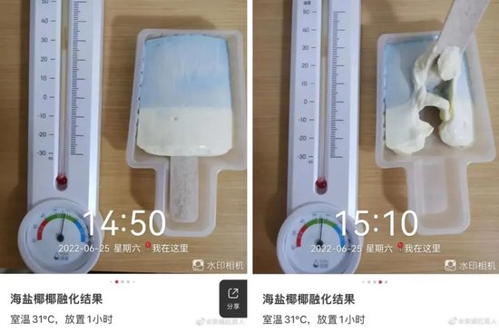 “从化学的角度来讲,钟薛高因为卵白质含量高,遭遇高温会碳化,而不是化成水,同期碳化上层会发黑,还有卵白质毁掉的刺鼻臭气齐会出来。”