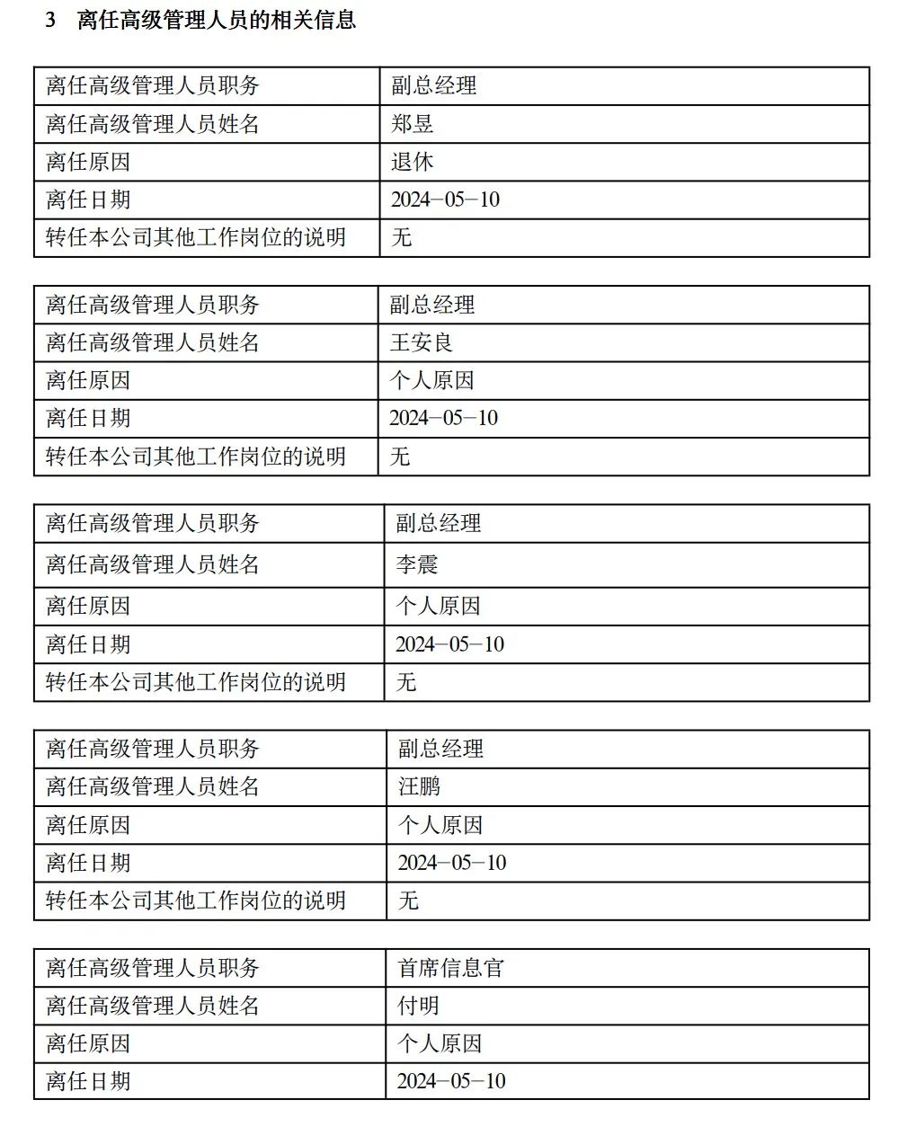 说明江信基金公告,5名高管的离任时候王人是5月10日。其中郑昱、王安良、李震、汪鹏在离任前王人是江信基金的副总司理,郑昱的离任原因是“退休”,其他3东谈主则因个东谈主原因而离开;另别称离任高管是江信基金的首席信息官付明,离任原因亦然“个东谈主原因”。