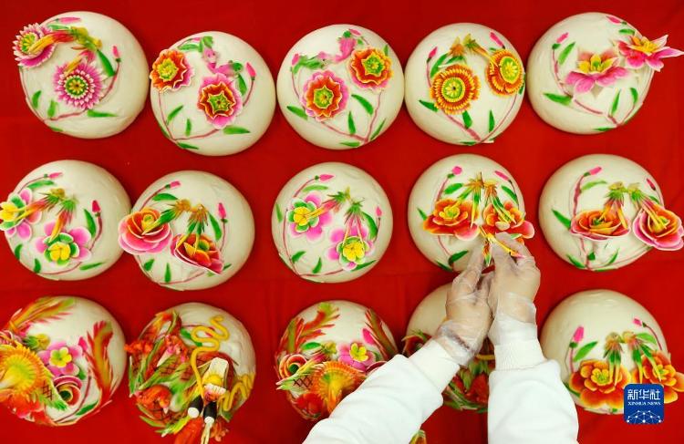 春节周边,山东省青岛市即墨区的农民赶制花馍等传统面食,供应节日商场。即墨当地有过年作念花馍的习俗,寓意新的一年日子红红火火,活命百废俱兴。