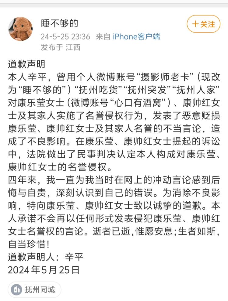 包括抚州市公安局民警辛平在内的多名网友在网罗平台发布针对康家东说念主的失当言论。据红星新闻2021年12月27日报说念,抚州市公安局联系发达东说念主复兴:“辛平同道在这个经由中有冲动,不了解事情的情况,如实存在,咱们市局党委也凭据他的情况作念出了处理。”