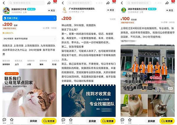 乞助找猫找狗的“宠物阅览”,靠谱吗?但在这个节骨眼上,“铲屎官”小易只好聘用试试。她在闲鱼App的同城页面搜索“找猫”后,快速锁定了一家同在余杭区的搜猫团队。