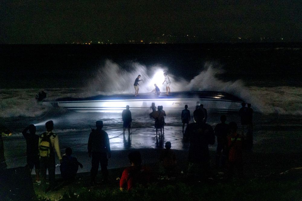 8月5日,在印度尼西亚巴厘岛,责任主谈主员将倾覆快艇拉到岸边。