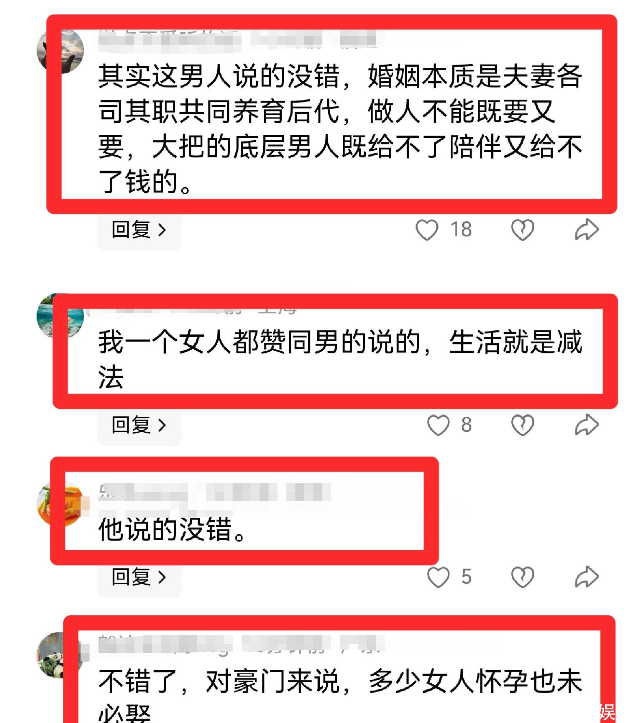 关联词无意的,采集上的公论,好多网友却齐是站在了路行这一边:“我一个女的齐赞同男的说的”,“作念东谈主不可既要又要,大把底层男东谈主既给不了奉陪又给不了钱”;“可以了,对权门来说,些许女东谈主孕珠随机娶”。