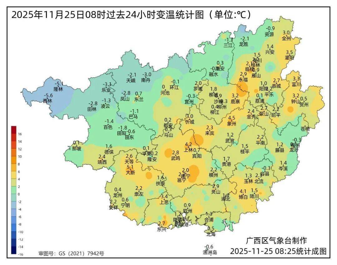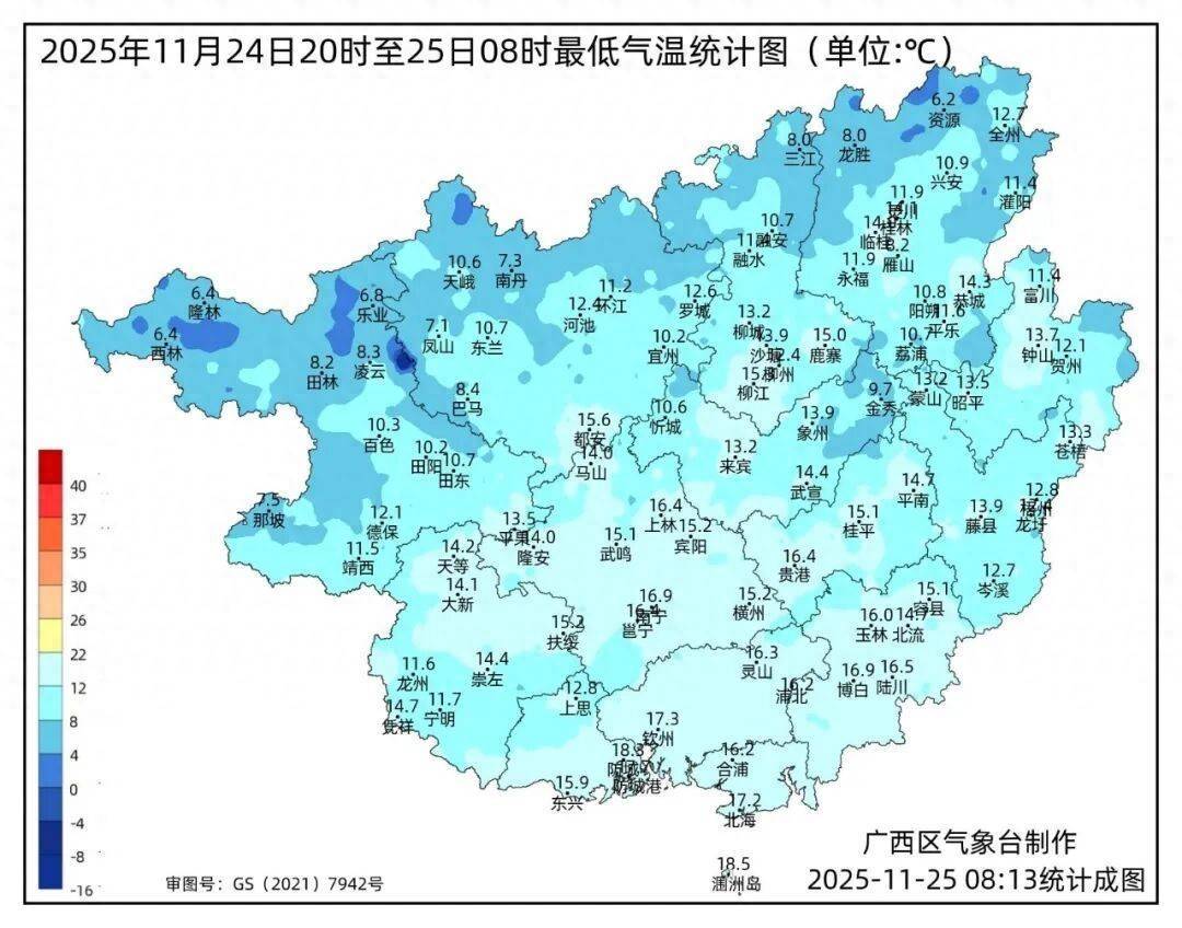今天晚上到来日白日,全区晴到少云,高寒山区局地有霜冻。最低气温:高寒山区-2~3℃,桂北4~10℃,桂南8~14℃。