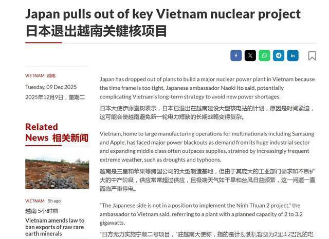 绪论 2024年9月,日本驻越大使一句"工期太紧",宣告了宁顺二号核电站的物化。 十年插手、无数公关、深度布局,最终换来惨淡结束,更耐东说念主寻味的是,就在不久前,越南还踩到了日本企业的"禁摩令"红线。 日本为何宁愿认栽?中国又在等什么?