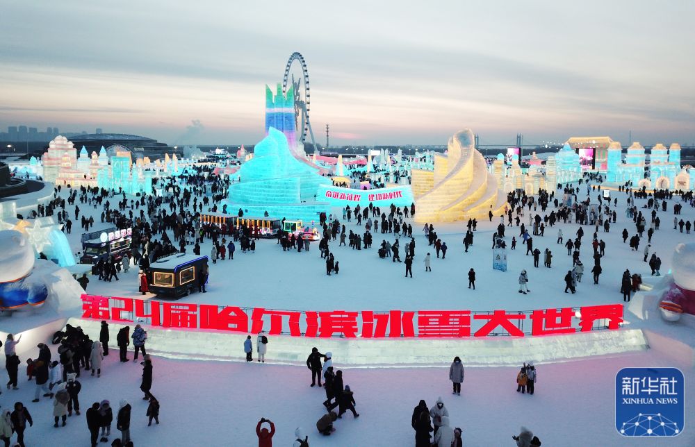 ↑1月25日,旅客在哈尔滨冰雪大宇宙园区游玩(无东说念主机像片)。新华社记者 王建威 摄
