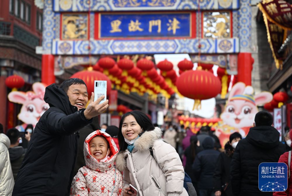↑1月26日,旅客在天津古文化街游玩时留影。新华社记者 赵子硕 摄