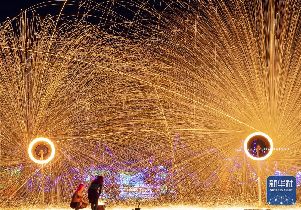 ↑1月25日晚,民间艺东说念主在四川省华蓥市禄市镇六水沟村“百万玫瑰”生态园饰演“打铁花”。新华社发(游青 摄)