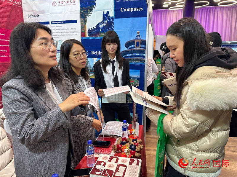中国高校使命主谈主员在现场为蒙古国粹生提供盘考。东谈主民网记者 张一又辉摄